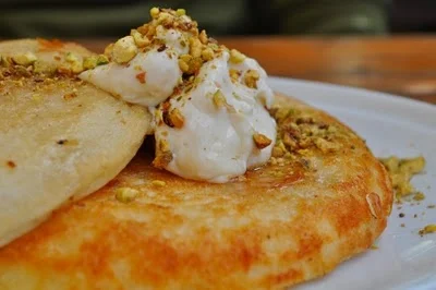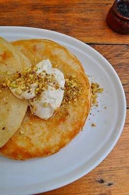 The semolina gave the pancakes a light, grainy, sandy texture. And they were insanely fluffy and airy, which was very fortunate. Why? Well, you get a little jug of orange honey syrup to pour over your pancakes. This fluffy texture created grooves in the pancakes, into which the syrup would seep in an oh so sensuous manner. Sigh. It was a thing of beauty. The yoghurt served atop of the pancakes was a welcome departure from the saccharine syrup. Crushed pistachios are just the icing on top of the pancake.