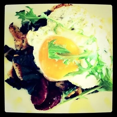 Ben chose the Italian-style pork sausage, with burnt-butter gnocchi, fried duck egg + swiss chard. This was really rich, but supremely delicious. The sausage was by Istra and was incredibly tasty. The burnt butter gnocchi was beautiful, golden deliciousness. This was a really yummy dish, truly beautiful (although a tad too buttery overall for me at 9am on a Sunday).