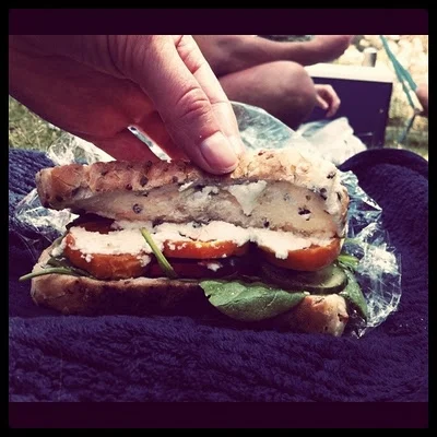 Salad Sandwich: avocado, cucumber, tomato, spinach leaves, leftover sweet potato rounds and goats cheese. On Multigrain.
