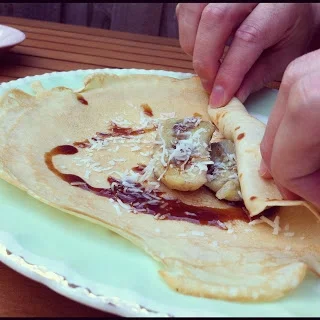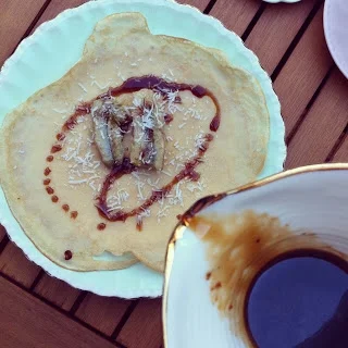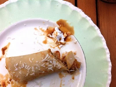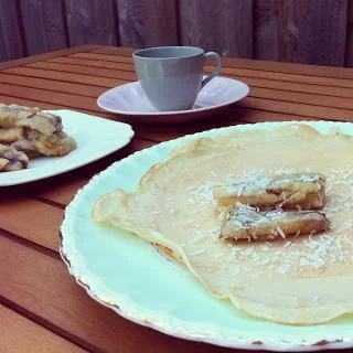 6. To serve, place one crêpe on your plate. Add a couple of banana pieces, scatter the toasted coconut and then drizzle with coconut palm sugar syrup. Roll the crêpe and serve with a dollop of coconut yoghurt (or ice-cream) and an extra cheeky drizzle of syrup if you're keen. Repeat with remaining crêpes and goodies until you're satisfied.