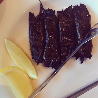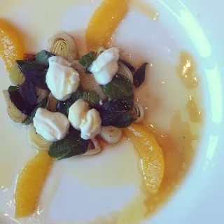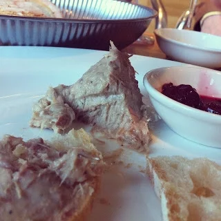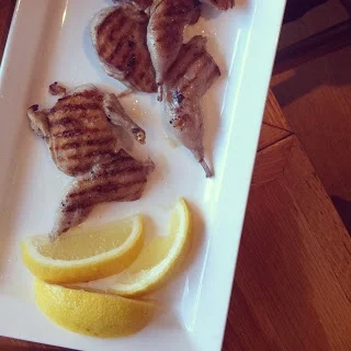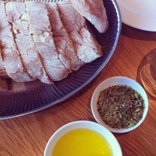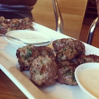 Bread with olive oil and pistachio spice, quail, duck rillettes, mushrooms in vine leaves, leek with goats cheese and orange, lamb meatballs.