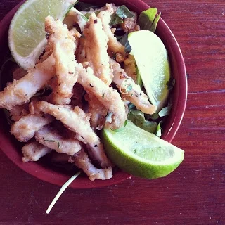 Calamari with lime, steak sandwich with caramelised onions and beetroot relish, chips with aioli and a rocket and fennel salad.