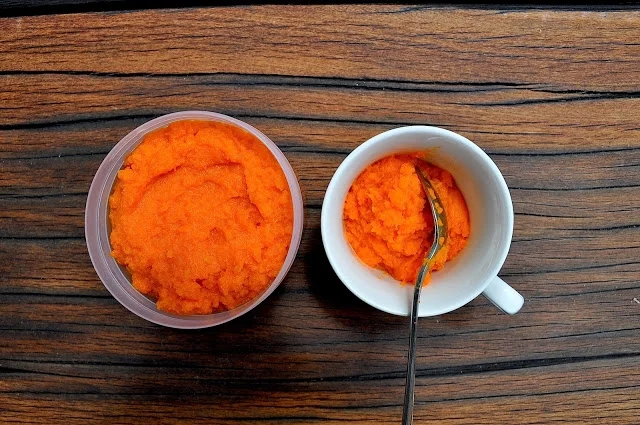 1. Steam the chopped carrots for ~10-15minutes until soft. When done, rinse the carrots under cold water. Reserve the steaming water for later use.