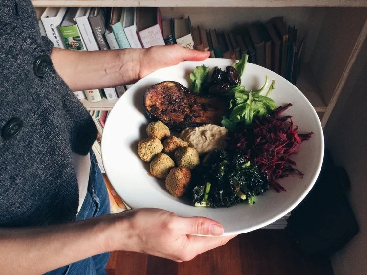 They key components of my abundance bowls are a roasted vegetable of some earthy variety + a protein (falafel, grilled prawns, marinated tofu or, at a pinch, boiled eggs or tinned fish) + loads of interesting, textured vegetables (leftover roasted kale or cabbage, grated beetroot or carrot, spinach leaves or rocket, fresh herbs) + dressings/sauces/dips/olives. Vary the particulars as you wish, play with the seasons and your cravings and "leftovers" situation. Try as I might, I find it difficult to stick to eggplant season (they're more of a Summer/Autumn food) and I do purchase them year round. Ben and I just cannot get enough. And as they travel well across many different dishes, cuisines and cravings, they tend to feature in many of our "abundance bowl meals". I intend on returning soon with my Mexican-inspired abundance bowl. It involves creamy spiced corn and prawns and is everything you want in a lazy, late-Summer meal with a cold beer and salty hair.